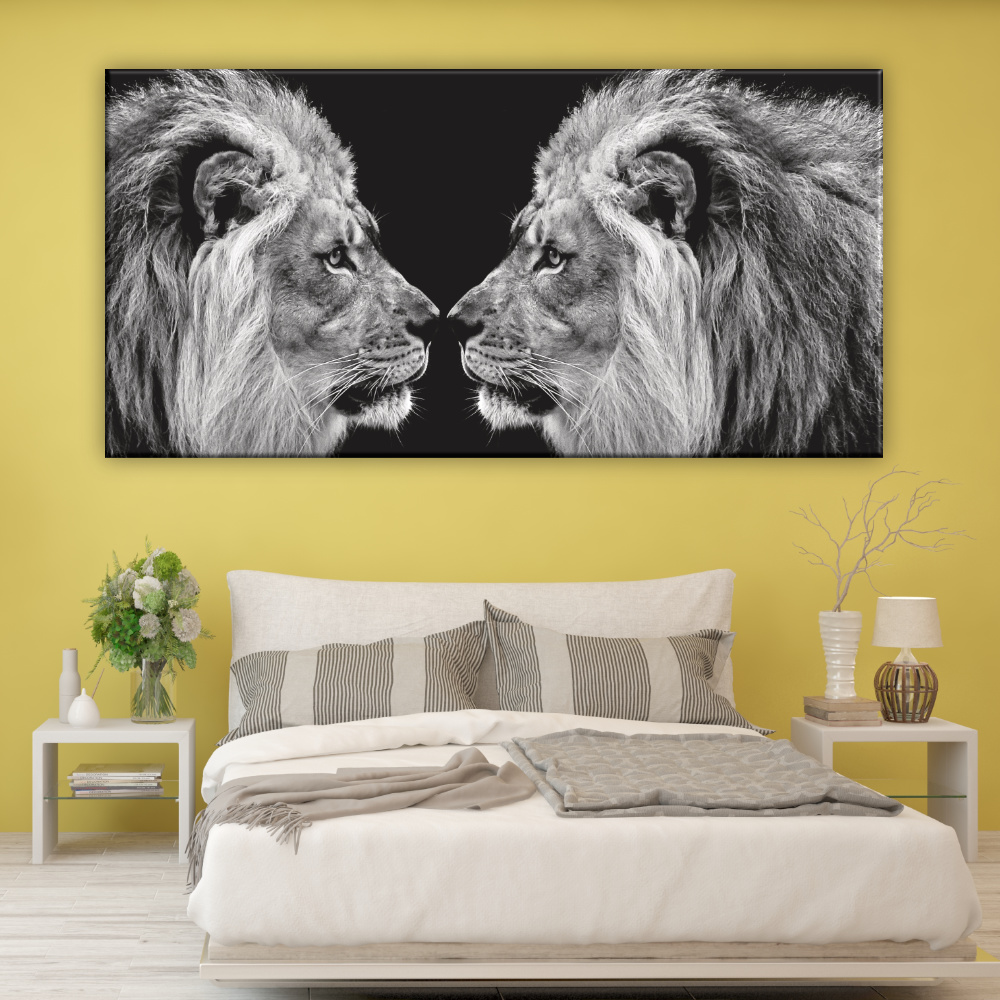 Acquisisci forza e coraggio con il nostro quadro che raffigura le teste di due leoni in bianco e nero. Arricchirà il tuo arredamento con il coraggio che questi leoni rappresentano, dando una magnifica immagine alla tua casa.