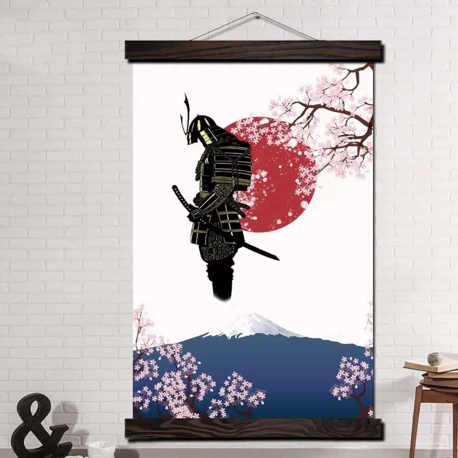 Un dipinto colorato che celebra la forza dei guerrieri giapponesi e la bellezza di questa cultura.